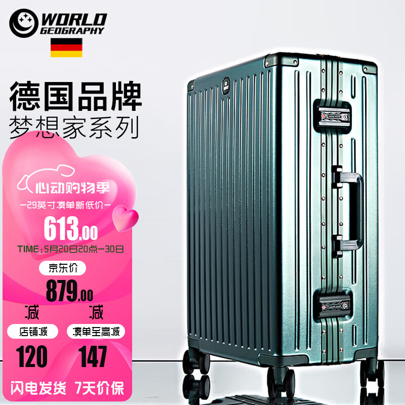 地理德国行李箱男女29英寸铝框旅行箱杯架拉杆箱万向轮密码箱 英伦绿价格:879.00元!