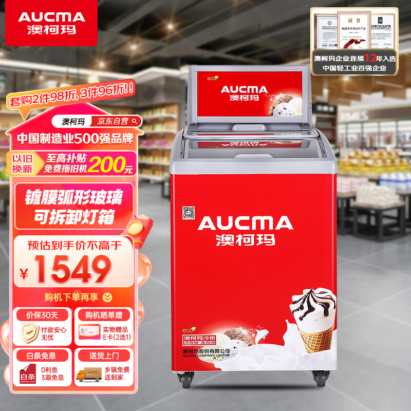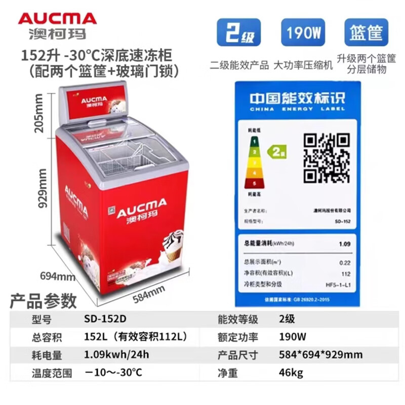 澳柯玛(AUCMA)152升小型立式多篮筐卧式弧形玻璃速冻冷柜商用展示柜雪糕柜 可拆卸灯箱 钢化玻璃 SD-152D价格:1399.00元!