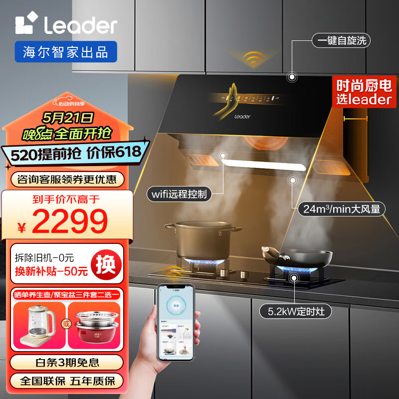 Leader海尔智家出品 抽油烟机 超薄近吸烟灶套装 24m3/min大吸力 家用油烟机燃气灶套装C2U1+Q2BE7天价格:2299.00元!