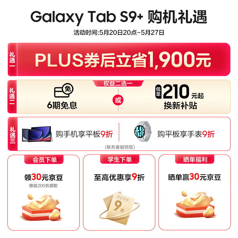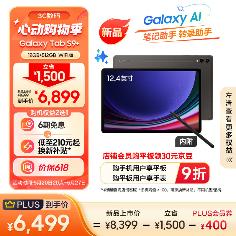 三星(SAMSUNG)S9+ Al智享学习办公平板电脑12.4英寸骁龙8Gen2 120Hz 12G+512GB WIFI版 AI平板 云影灰价格:6899.00元!