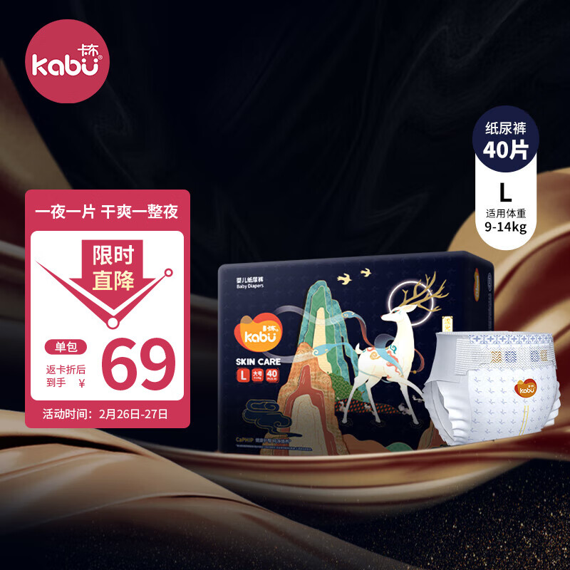 卡布KABU流光溢彩纸尿裤L码40片(9-14KG) 尿裤尿不湿 夜用安睡价格:69.00元!