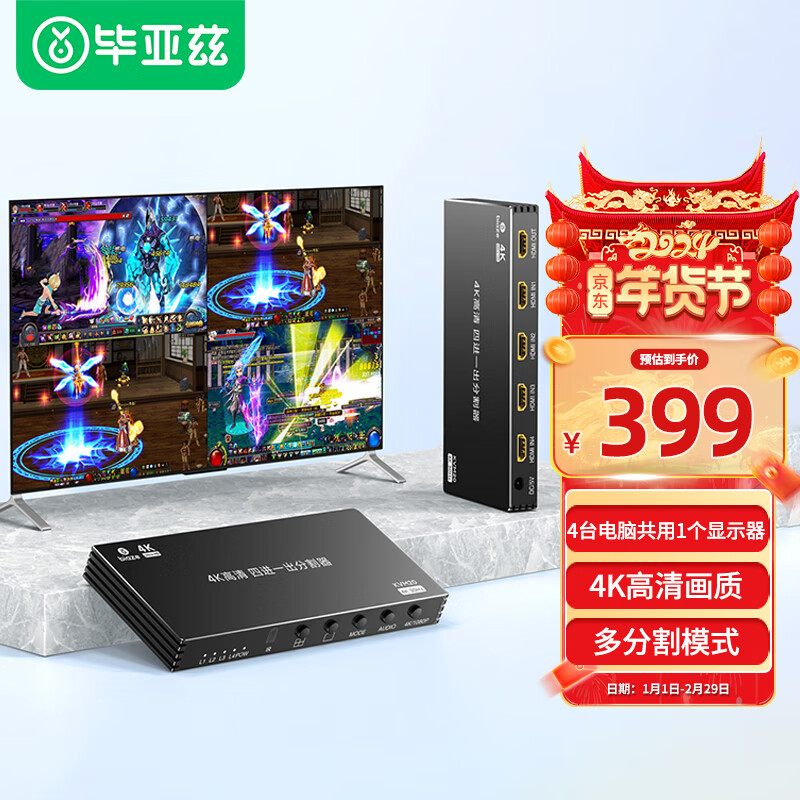 毕亚兹 HDMI分割器四进一出 4K高清4进1出分配器支持dnf游戏搬砖电脑分屏器监控同步拼接器画面合成器价格:399.00元!