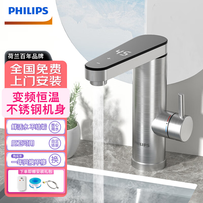 飞利浦(PHILIPS)电热水龙头 变频恒温不锈钢冷热两用电热水龙头即热式小厨宝速热家用卫生间电热水器AWH1024SS/93价格:659.00元!