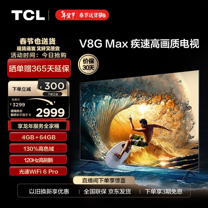 TCL电视 65V8G Max 65英寸 4+64GB 高色域 120Hz WiFi 6 Pro 平板电视机 以旧换新 65英寸 官方标配价格:3299.00元!