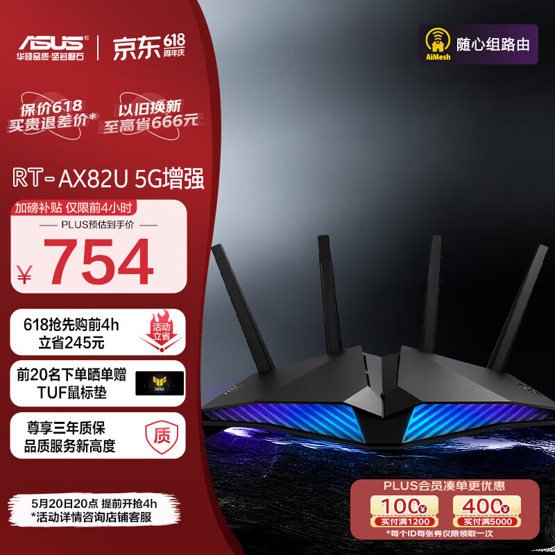 华硕(ASUS)RT-AX82U双频5400M无线全千兆路由器/RGB电竞灯效/WiFi6穿墙/电竞路由/Ai路由【5G增强版】价格:745.00元!