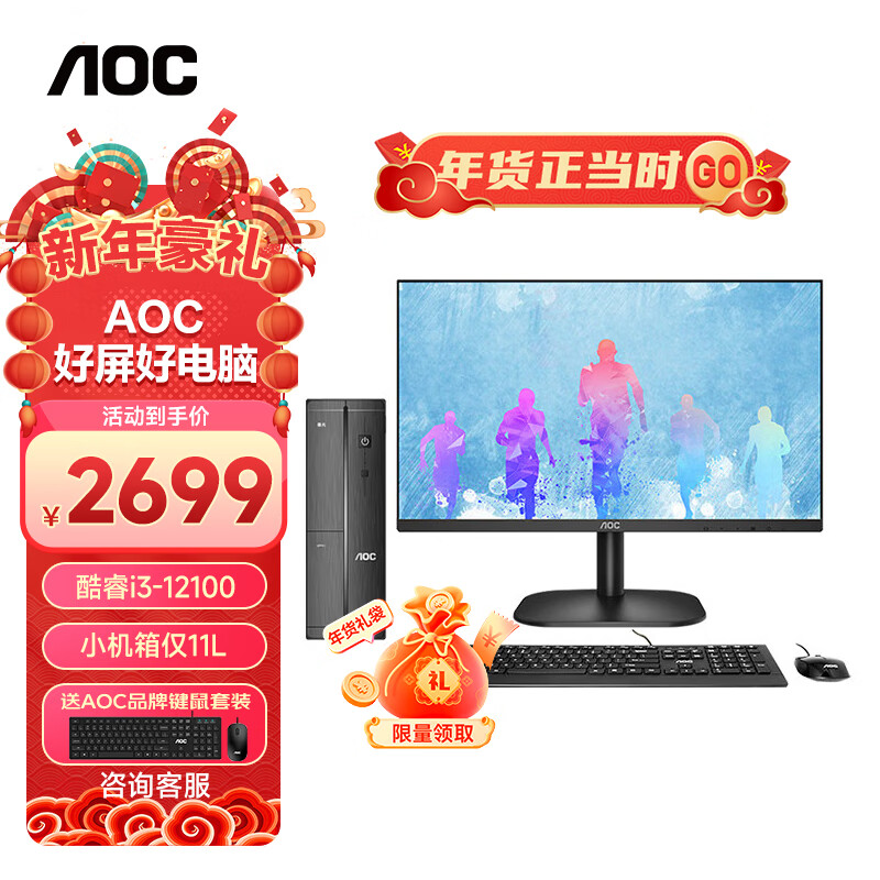 AOC 荣光910 高性能商用办公台式机电脑主机(12代i3-12100 16G 1TB WIFI键鼠 三年上门)23.8英寸价格:2699.00元!