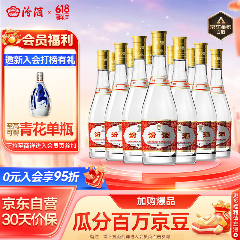 汾酒黄盖玻汾 清香型高度白酒 53度 475ml*12瓶 整箱装价格:598.00元!