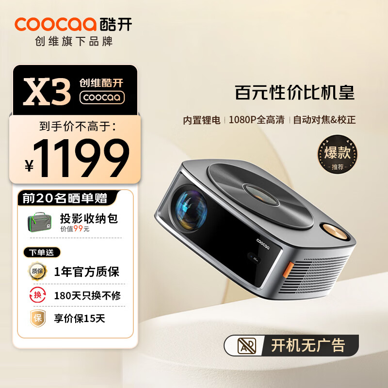 酷开X3投影仪家用智能卧室 便携户外露营家庭影院投影机 (内置电池 1080P全高清 自动校正)价格:1199.00元!