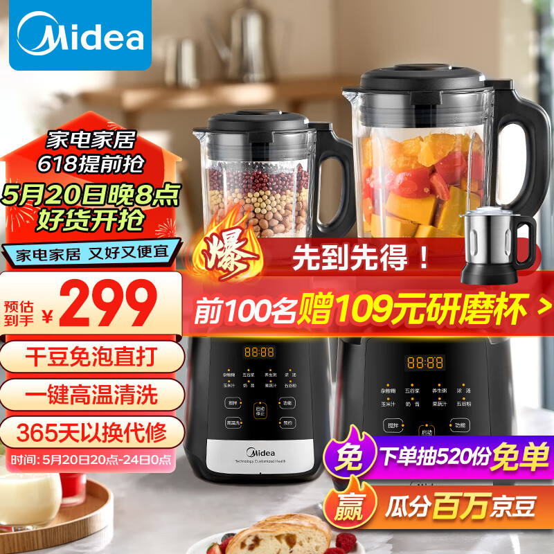 美的(Midea)破壁机1.75L家用多功能料理大容量豆浆机果汁榨汁婴儿辅食机高温清洗MJ-PB10X2-100A/100C价格:299.00元!