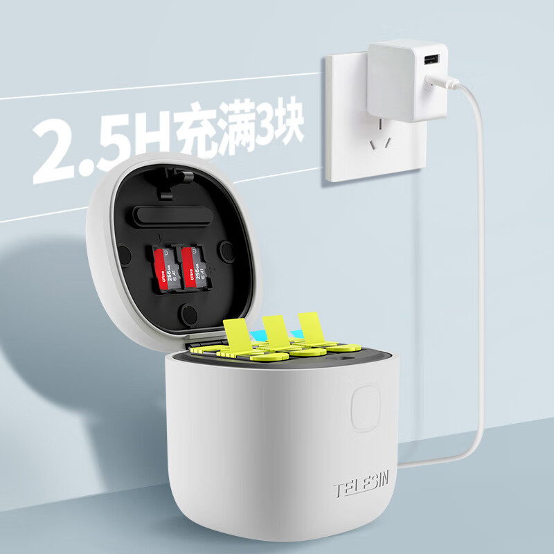 TELESIN适配gopro11电池充电器gopro12电池hero10 9配件2A快充收纳电池内存卡读写 同时三充充电盒价格:251.10元!