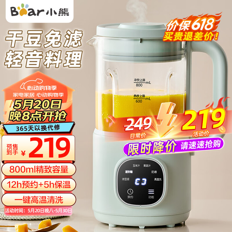 小熊(Bear)豆浆机家用 迷你破壁机 小型米糊机 多功能全自动清洗免过滤 1-3人食 PBJ-E05K1 0.8L价格:219.00元!
