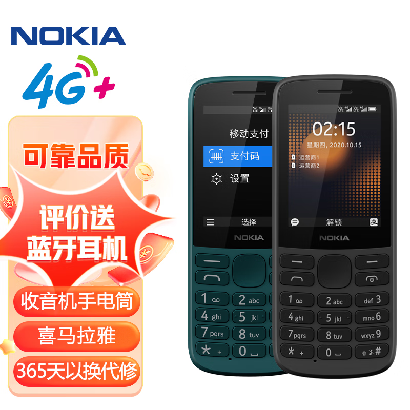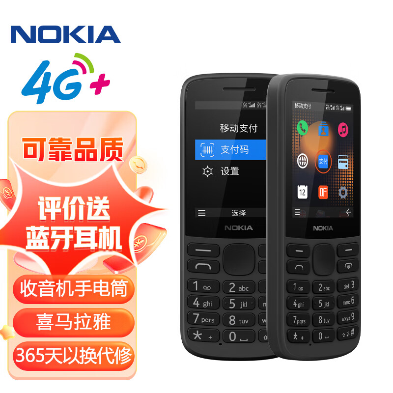 诺基亚(NOKIA)215 4G支付版 移动联通电信三网4G 黑色 直板按键 双卡双待 备用功能机 老人老年手机 学生机价格:199.00元!