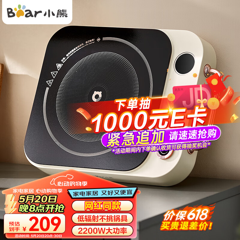 小熊(Bear)家用电磁炉 大功率电陶炉 小型电磁灶 一键爆炒炒菜 智能内外双环围炉煮茶电池炉2200W DTL-D22A1价格:209.00元!