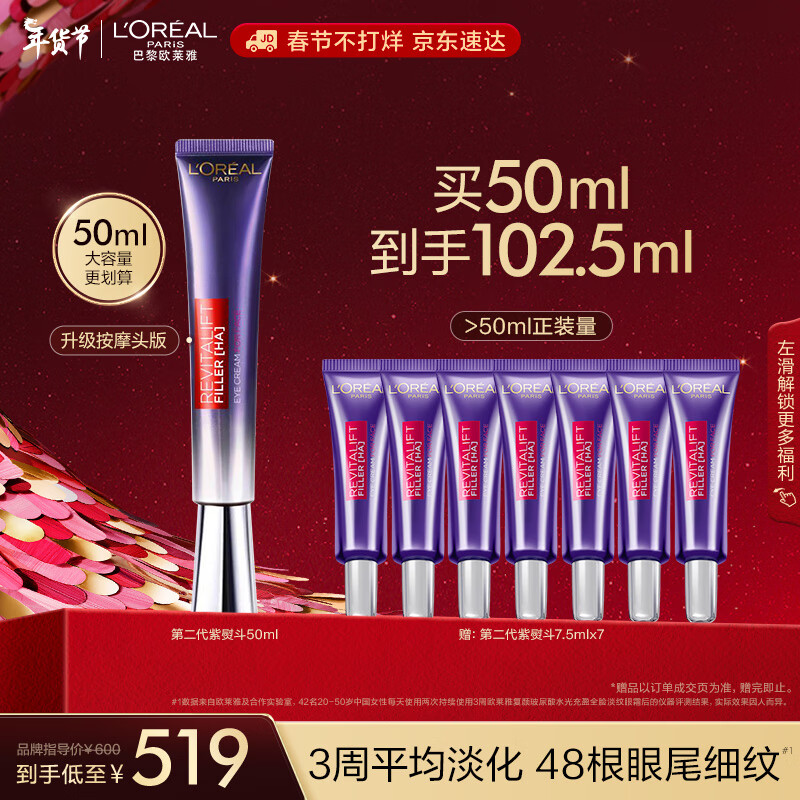 欧莱雅紫熨斗眼霜2.0 50ml 按摩头玻色因淡纹提亮护肤品情人节新年礼物价格:519.00元!