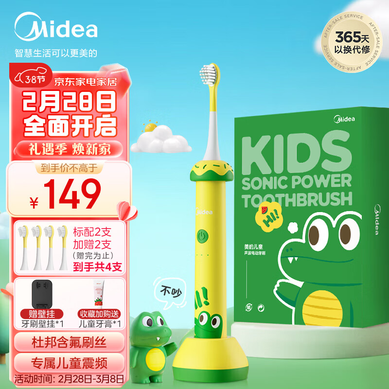 美的(Midea)儿童电动牙刷 声波震动 专业防蛀 软毛护龈 可充电 三种模式 智能定时 YE1 (适用3-12岁)黄价格:149.00元!