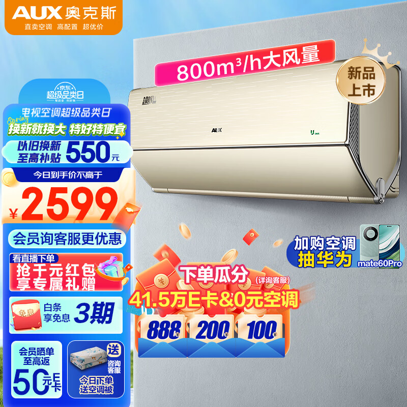 奥克斯(AUX)1.5匹御风Pro空调挂机 新一级能效 UVC除菌 多维御风KFR-35GW/BpR3HQB1(B1)170mm超大导风板价格:2599.00元!
