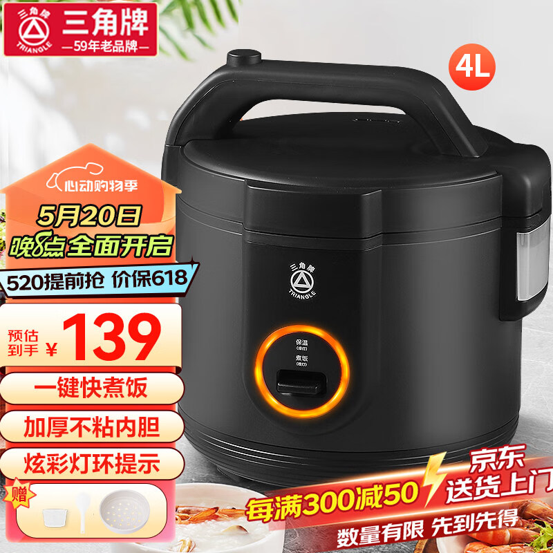 三角牌(Triangle)电饭煲迷你 家用智能大容量蒸米饭锅煮饭锅煲粥不粘西施煲黑色 3-5人用 4L价格:159.00元!