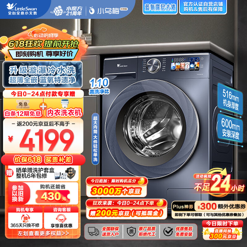 小天鹅(LittleSwan)滚筒洗衣机全自动 超薄全嵌【小乌梅高奢版TG100VIC】516mm机身 蓝氧特渍净 漩瀑水流 10公斤价格:4399.00元!