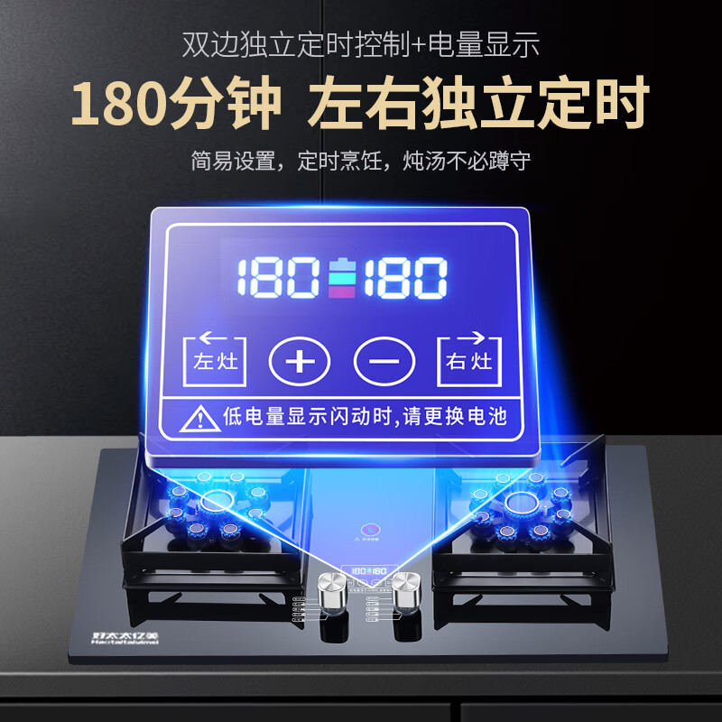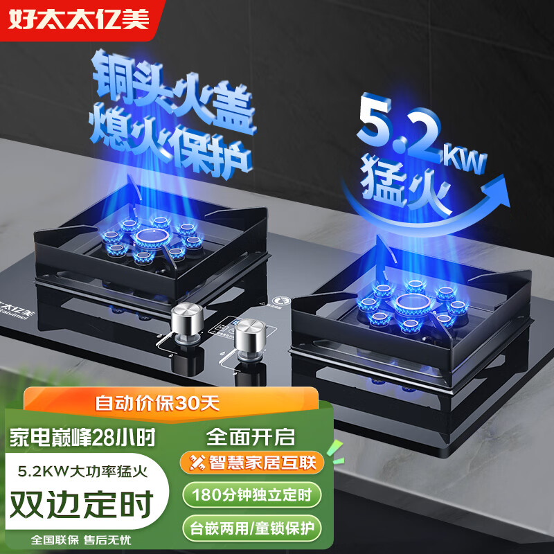 好太太亿美液化气燃气灶双灶家用煤气灶5.2KW猛火台式嵌入式猛火炉具玻璃方架定时双九头JZY-K08Y价格:459.00元!