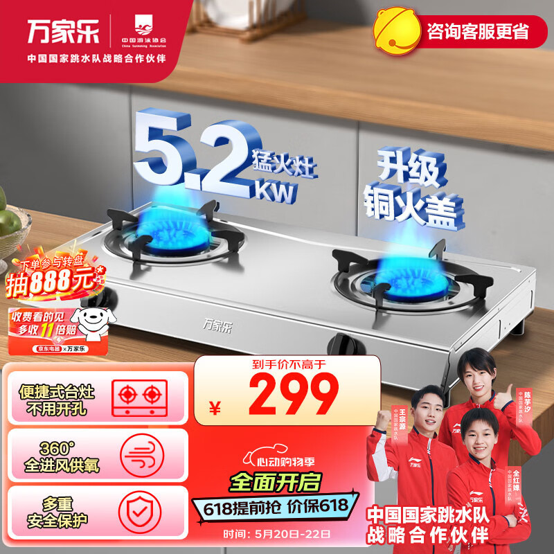 万家乐燃气灶具 5.2kW大火力天然气灶 不锈钢台灶天燃气灶双灶 家用台式燃气灶具JZT-ITB91天然气价格:298.00元!