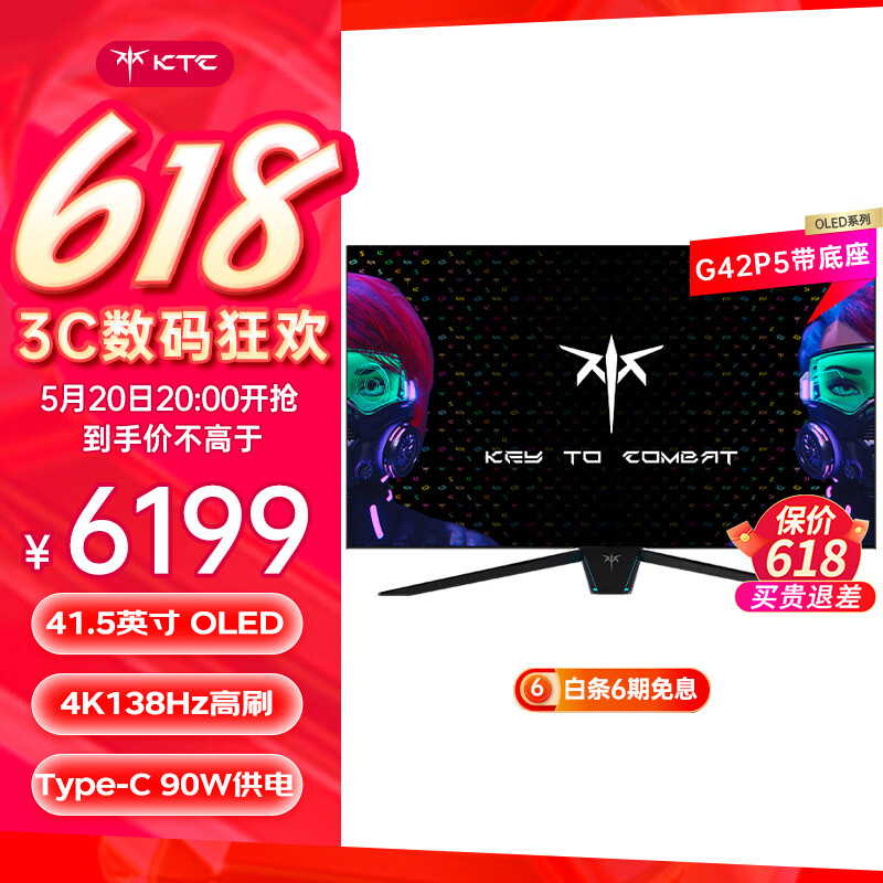 KTC41.5英寸OLED电脑显示器4K 138Hz 0.1ms 10bit 色准<2LGD原装电竞屏Type-C带音响kvm带底座G42P5价格:6999.00元!