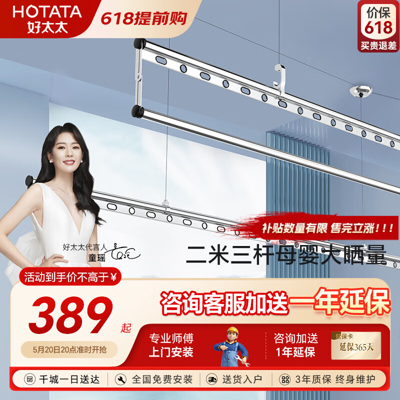 好太太(Hotata)晾衣架阳台三杆手摇晾衣杆升降手动室内室外 晒衣架家用晒衣架 D-1117 2.0米银色三杆+免费安装价格:388.00元!