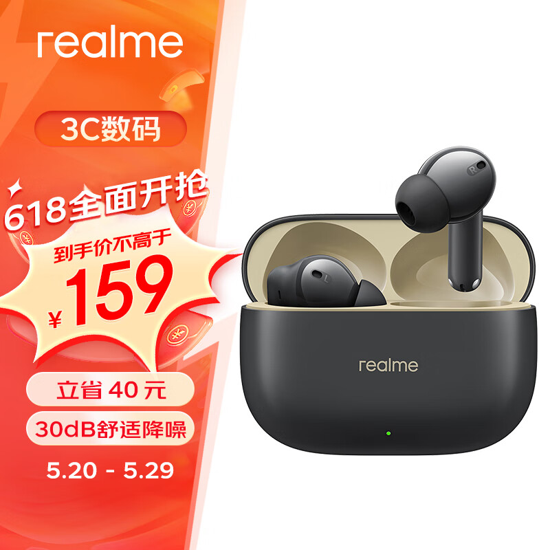 真我(realme)真我Buds T300 真无线蓝牙耳机 30dB舒适降噪 40小时长续航 华为苹果手机通用 动感黑价格:159.00元!