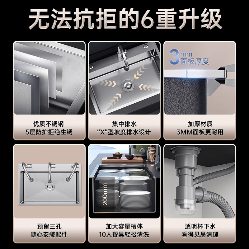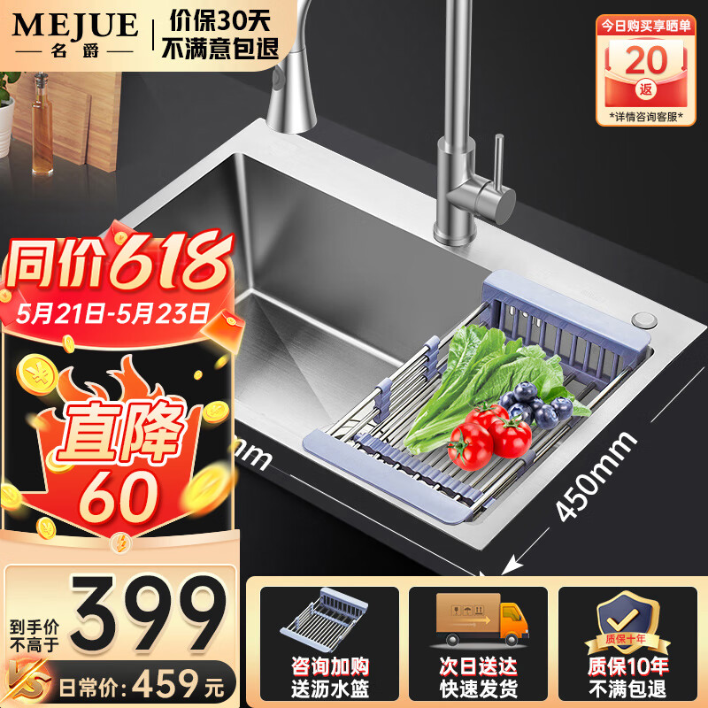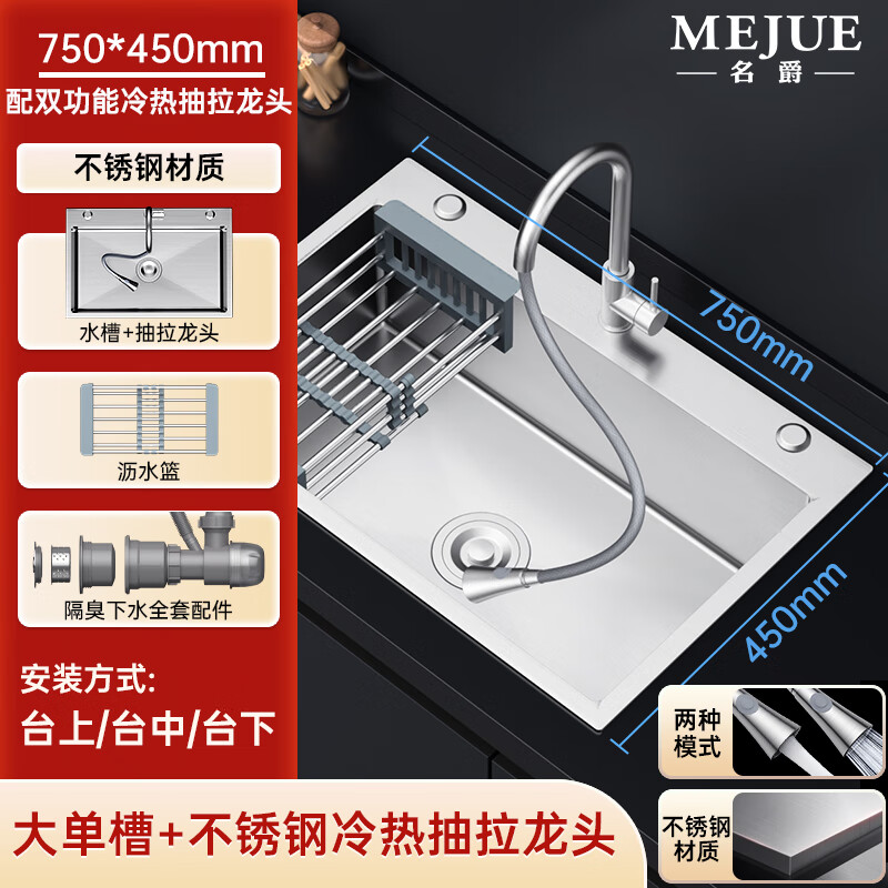 名爵(MEJUE)水槽厨房洗碗池一体盆洗菜盆304不锈钢龙头加厚大单槽多功能2466价格:459.00元!