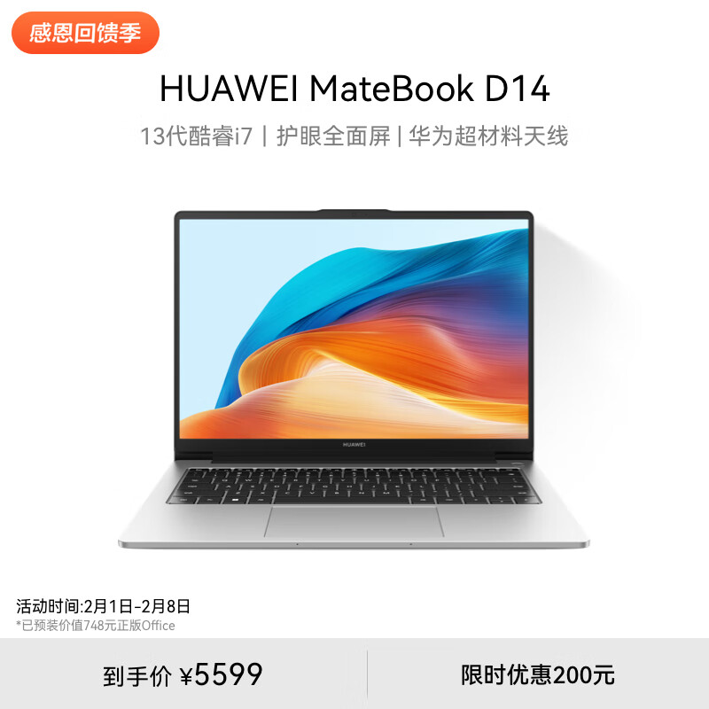 华为MateBook D 14 2023笔记本电脑 13代酷睿/14英寸护眼屏/轻薄办公本/超级终端 i7 16G IT 皓月银价格:5599.00元!
