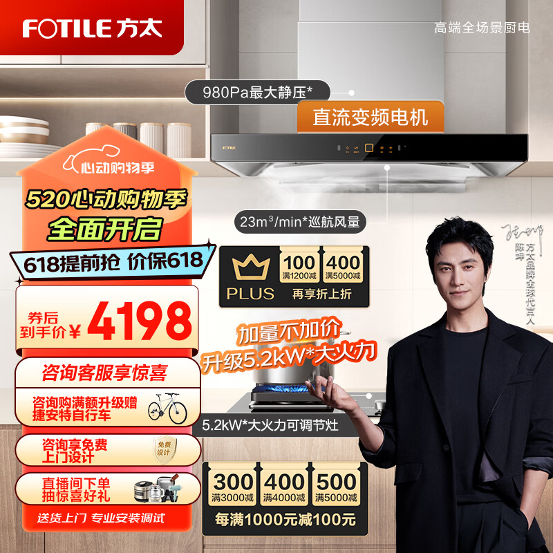 方太(FOTILE)抽吸油烟机燃气灶套装 欧式顶吸脱排烟机灶具套餐 直流变频23巡航风量02-EMD22T+02-TH27B天然气价格:4598.00元!