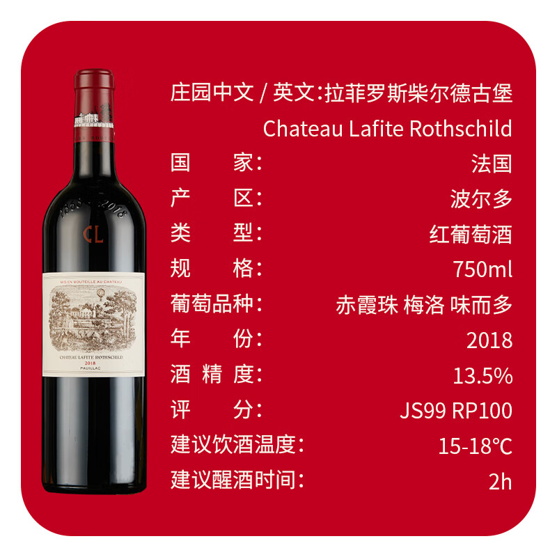 拉菲(LAFITE)大拉菲 正牌 2018年 750ml WE100分 1855一级庄【法国名庄】价格:8999.00元!