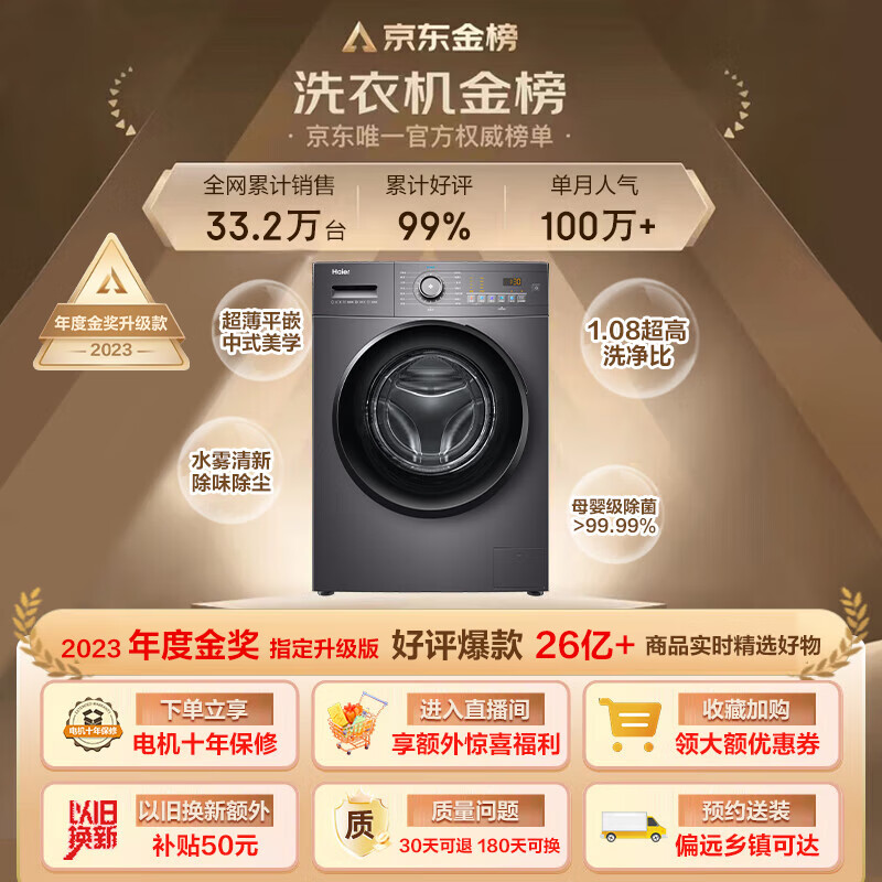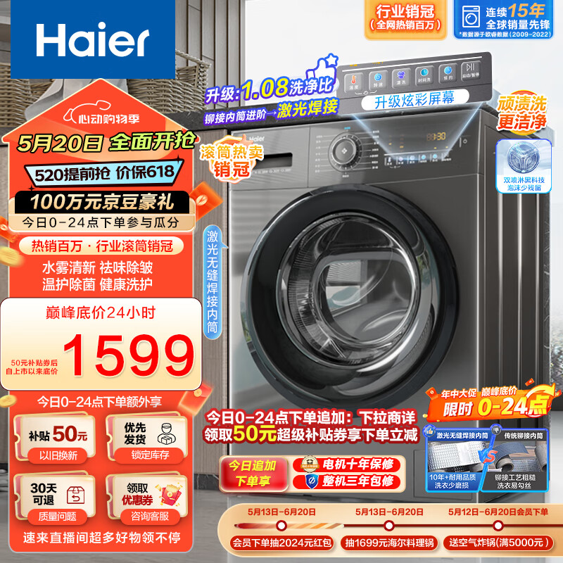 海尔(Haier)滚筒洗衣机全自动单洗 超薄家用 金榜推荐10公斤大容量【EG100MATE28S】排名前10名 以旧换新价格:1649.00元!
