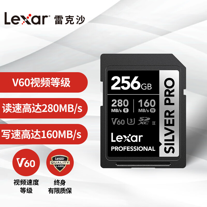 雷克沙(Lexar)256GB SD存储卡 C10 U3 V60 4K相机内存卡 读280MB/s 写160MB/s 捕捉光影(SILVER PRO) 价格:799.00元!