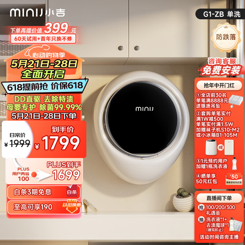 小吉(MINIJ)【对标李佳琦】2.5kg壁挂迷你滚筒洗衣机防跌落 DD直驱变频 婴儿内衣洗衣机 G1-ZB升级款 以旧换新价格:1899.00元!