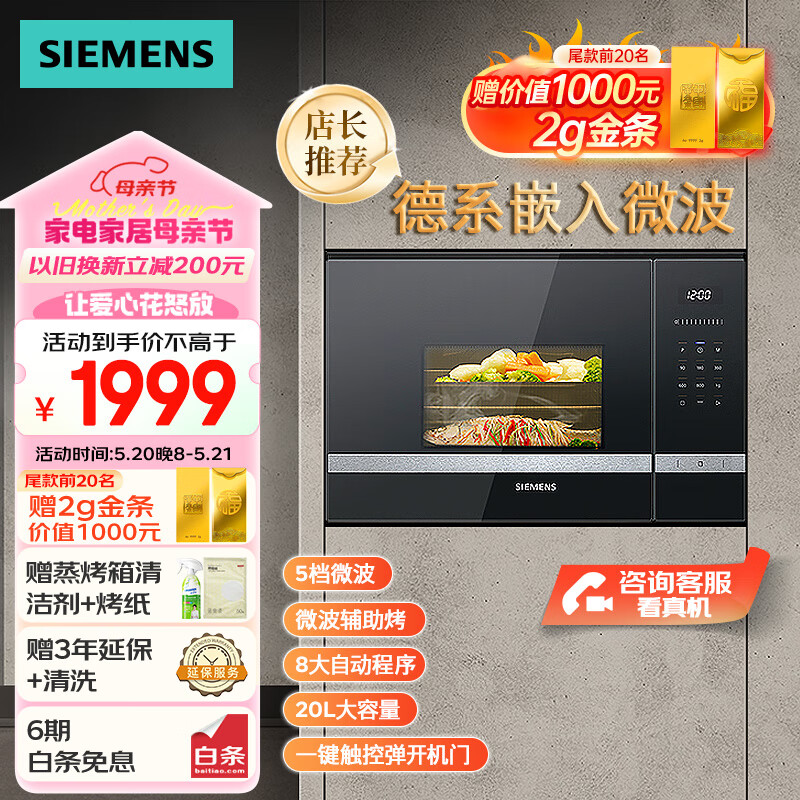 西门子(SIEMENS)微波炉嵌入式8种自动烹饪程序?20升 节能低耗 易清洁BE525LMS0W?西门子蒸烤系列产品 高38.2CM价格:2099.00元!