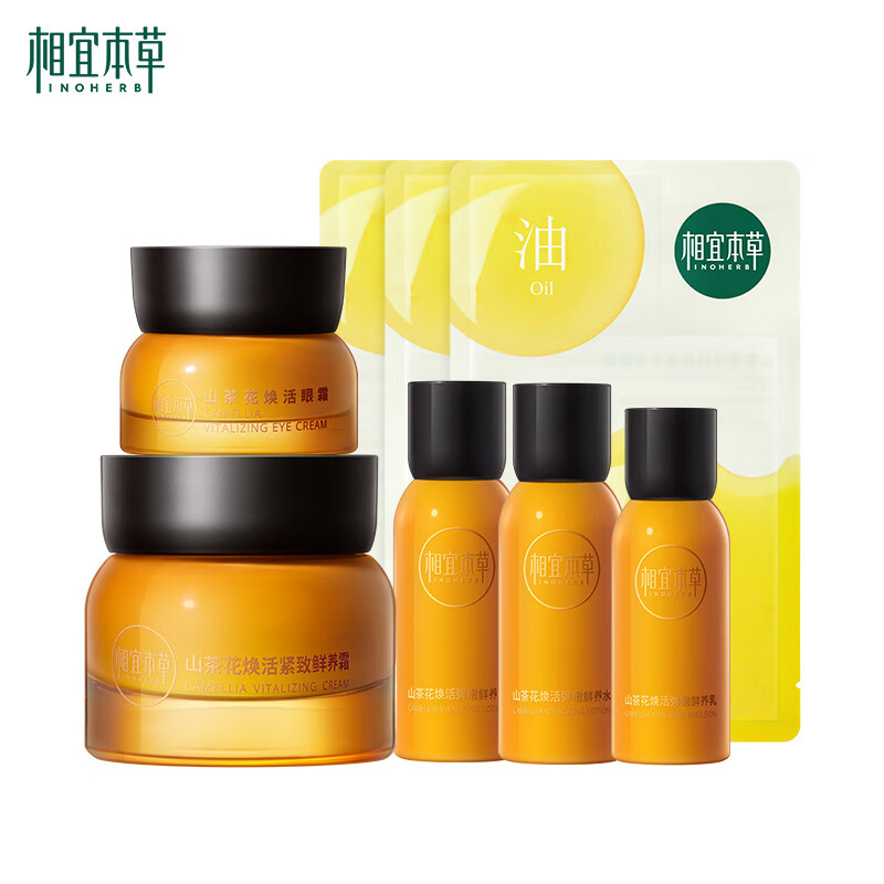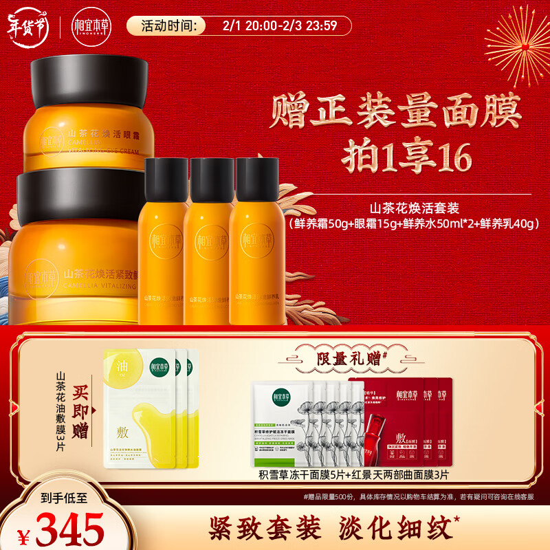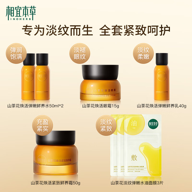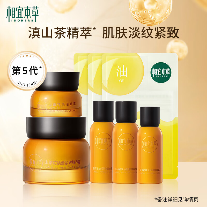 相宜本草山茶花焕活弹嫩鲜养淡纹套装(鲜养霜+眼霜+鲜养水+鲜养乳+面膜)价格:345.00元!