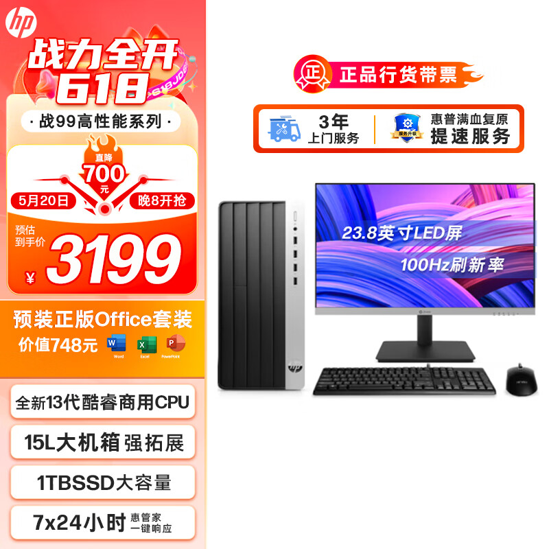 惠普(HP)战99 台式电脑主机(酷睿13代i3-13100 16G 1TBSSD)23.8英寸大屏显示器 WiFi 蓝牙价格:3199.00元!