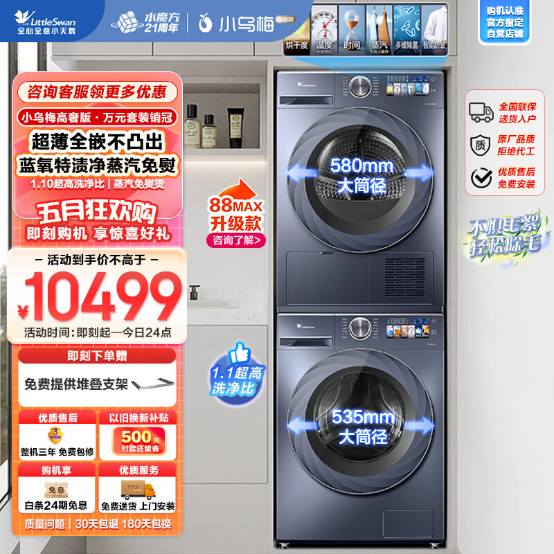 小天鹅(LittleSwan)洗烘套装 10KG滚筒洗衣机+热泵烘干机 超薄全嵌 【小乌梅高奢版】TG100VIC+S88【咨询了解升级款】价格:10499.00元!