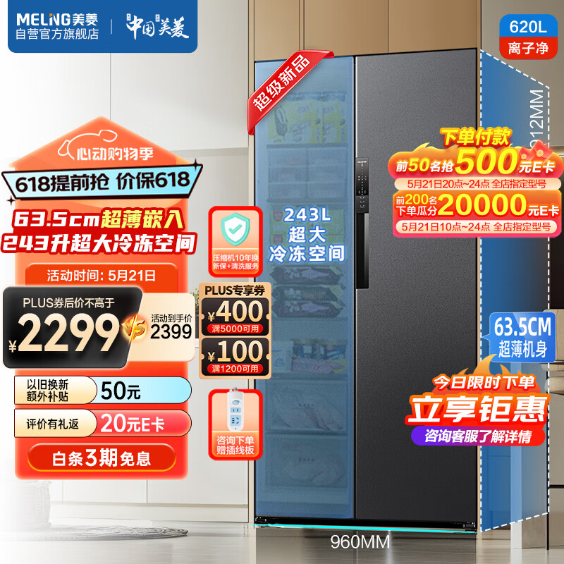 美菱(MeiLing)620升双变频一级能效对开门双开门冰箱家用节能风冷无霜净味大冷冻超薄可嵌入BCD-620WPCX超大容量价格:2399.00元!