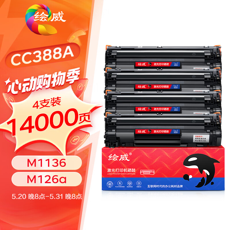 绘威CC388A 88A大容量硒鼓4支装 适用惠普HP 388a P1106 P1007 P1108 M1136 M1213nf M1216nfh打印机碳粉盒价格:209.00元!