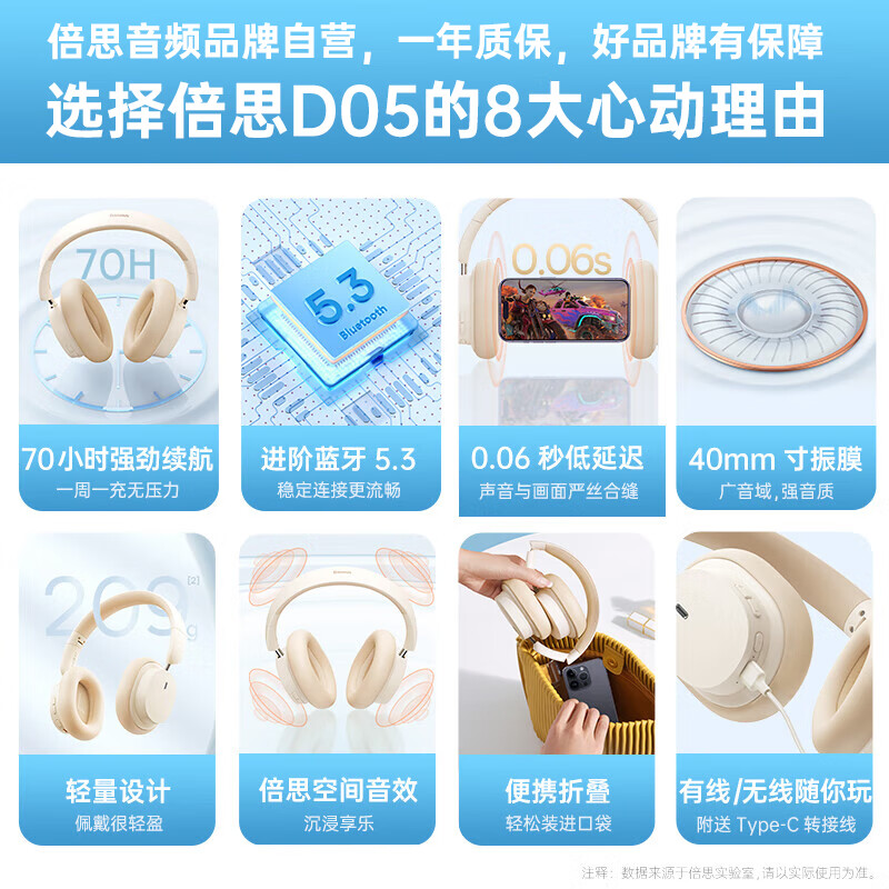 倍思 D05耳机头戴式蓝牙耳机真无线耳机高音质音乐学生电脑网课游戏运动超长续航隔音折叠包耳式云岩白价格:158.00元!