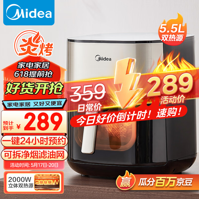 美的(Midea)小炎烤空气炸锅 双热源免翻面 可视 家用大容量 5.5L 炸烤箱一体 多功能 不沾易洗 KZC5504价格:359.00元!