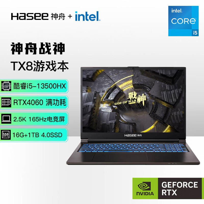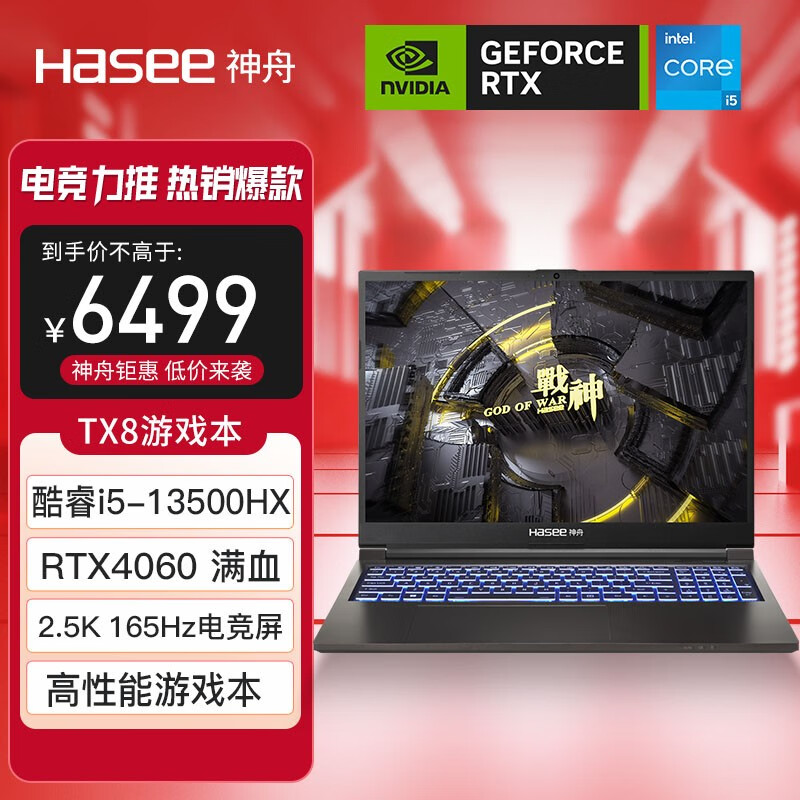 神舟(HASEE)战神TX8R5 13代英特尔酷睿i5 16英寸笔记本电脑(i5-13500HX RTX4060 165Hz 2.5K电竞屏)价格:6499.00元!