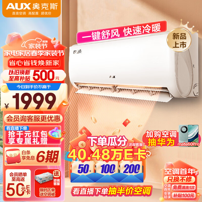 奥克斯(AUX)1.5匹省电侠空调 新能效 家用冷暖壁挂式 快速冷暖 一键舒风KFR-35GW/BpR3AQS1(B3)独立除湿价格:1999.00元!
