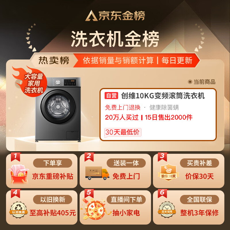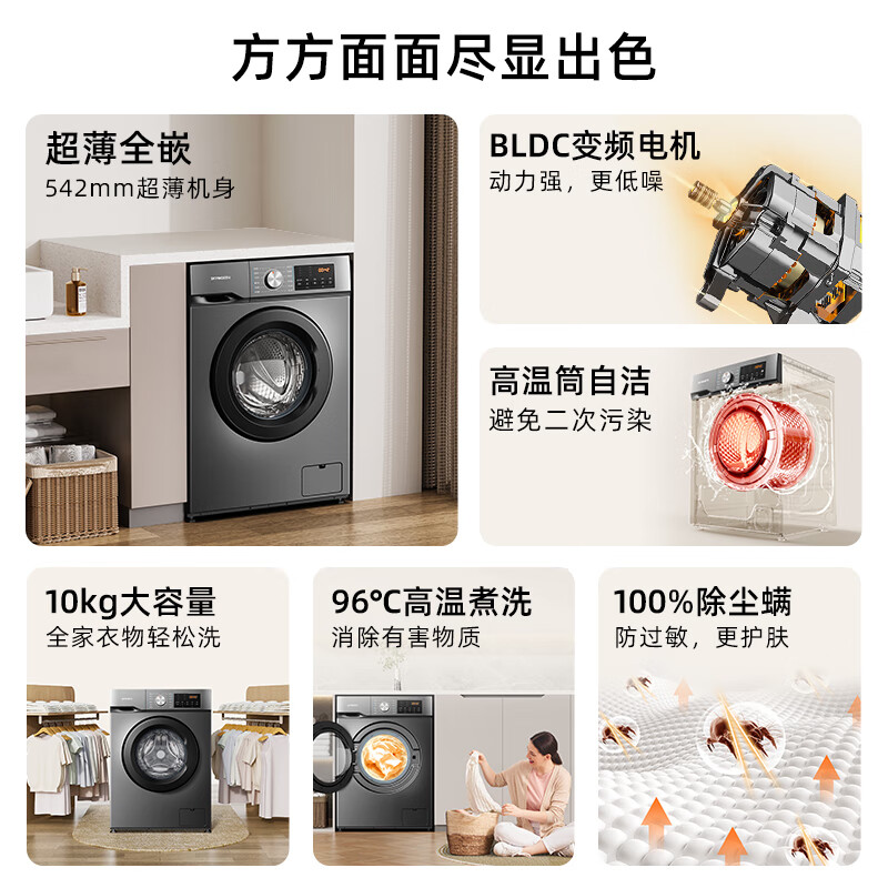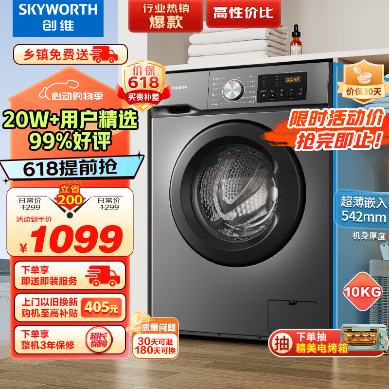 创维10公斤滚筒洗衣机全自动变频 一级能效 超薄大容量 除菌螨 以旧换新 XQG100-B26RB(E)价格:999.00元!