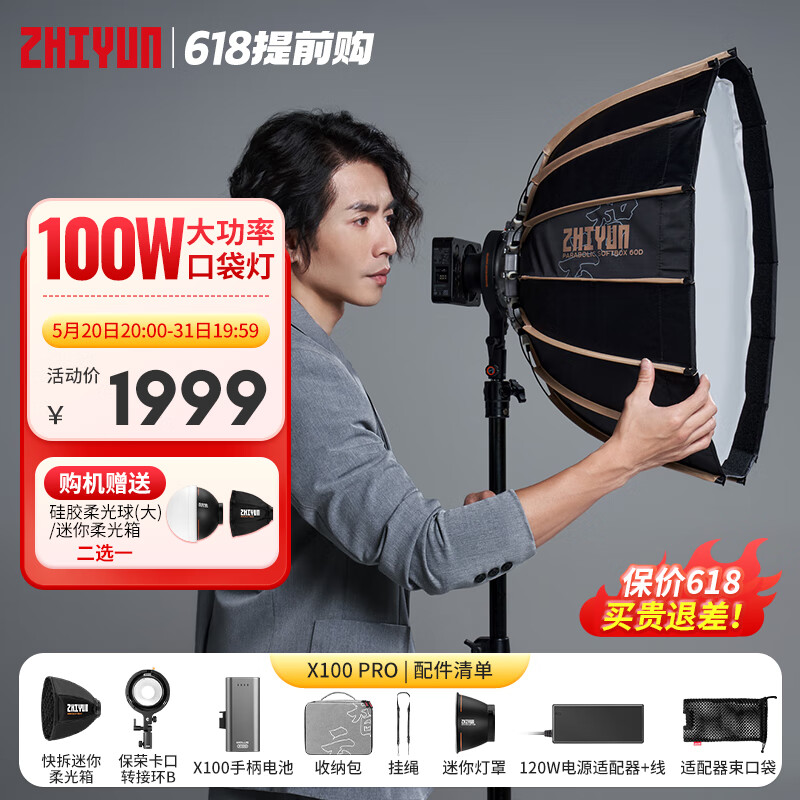 zhi yun智云功率王 X100便携直播补光灯美颜拍照摄影影棚灯室内室外人像拍摄灯100W COB口袋灯X100 PRO价格:1999.00元!