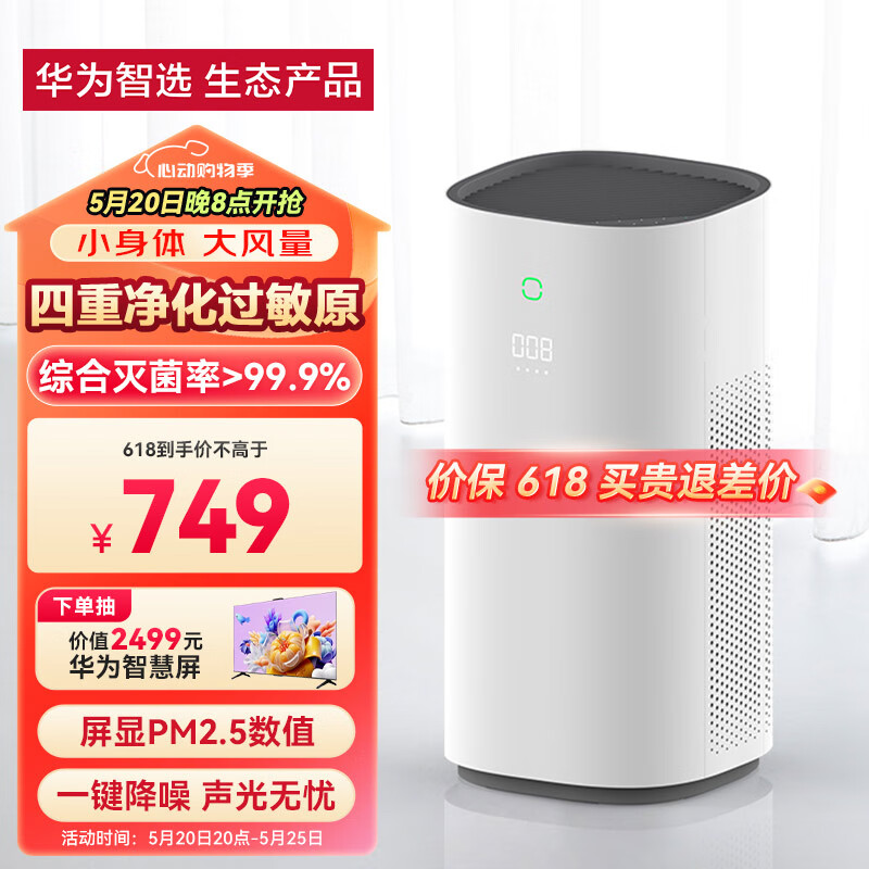 华为智选720空气净化器C400 除甲醛除菌除异味 除雾霾PM2.5 深紫外线灭菌 家用低噪小体积价格:749.00元!