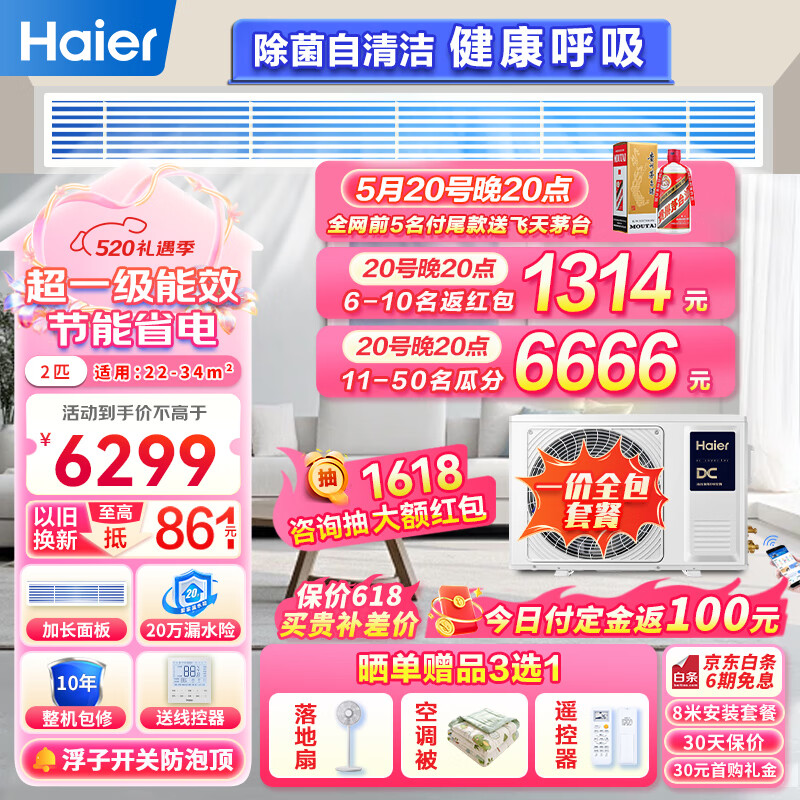 海尔(Haier)中央空调风管机一拖一2匹云璟pro家用2p变频冷暖自清洁全直流新一级能效KFRd-50NW/71EBA81U1价格:6299.00元!