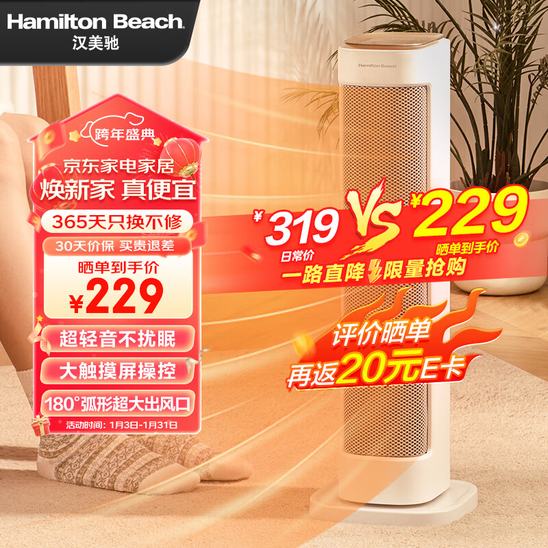 汉美驰(Hamilton Beach)智能恒温睡眠轻音速暖取暖器广域家用暖风机石墨烯定时远程遥控电暖气片HE20101价格:276.00元!