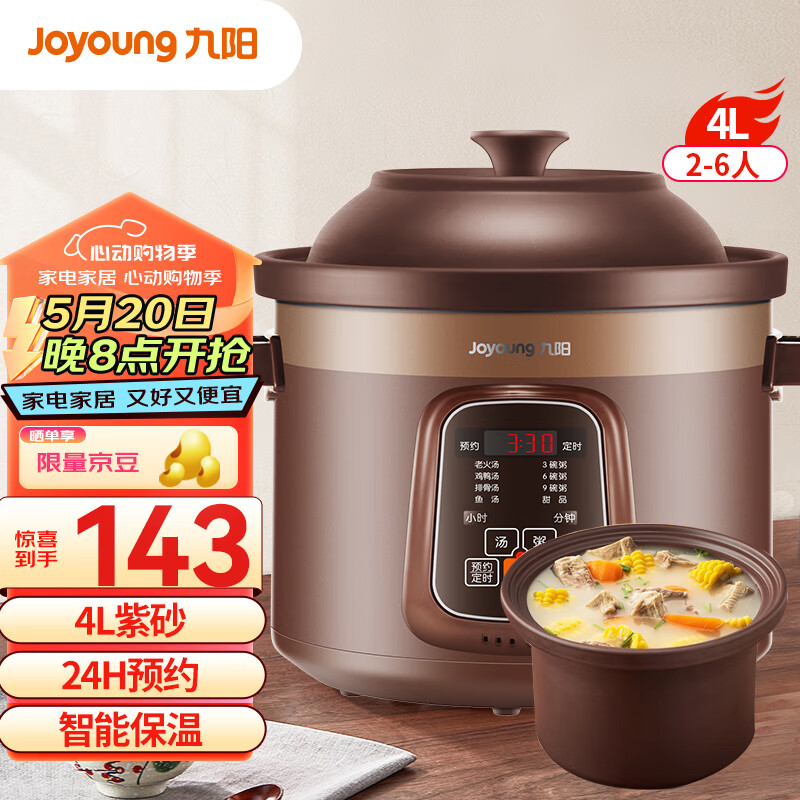 九阳(Joyoung)电炖锅电炖盅4L大容量紫砂预约电砂锅智能定时精炖煮粥煲汤锅GD410价格:143.00元!